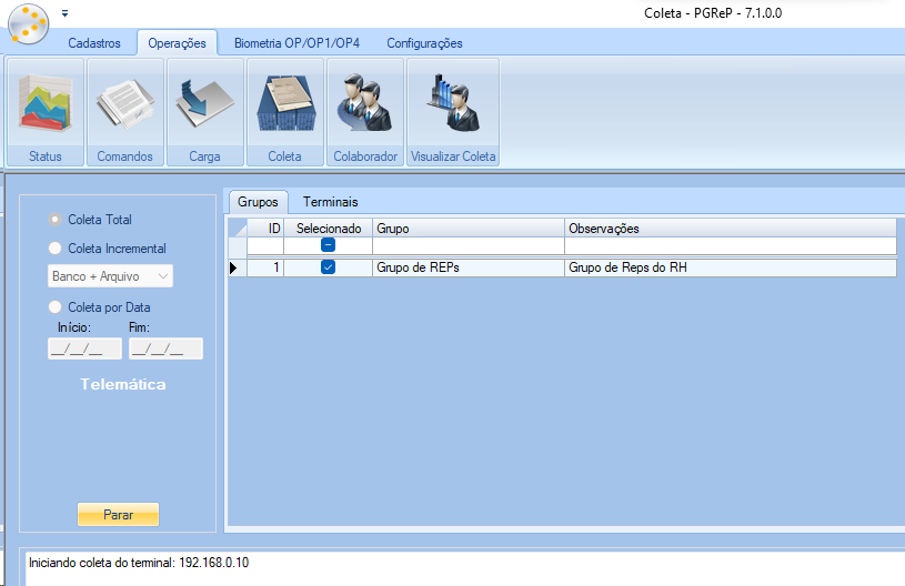 Nesta aba de Coleta, podemos selecionar os grupos de terminais ou apenas os terminais para os quais o software envia o comando de Coleta Total aos equipamentos selecionados.