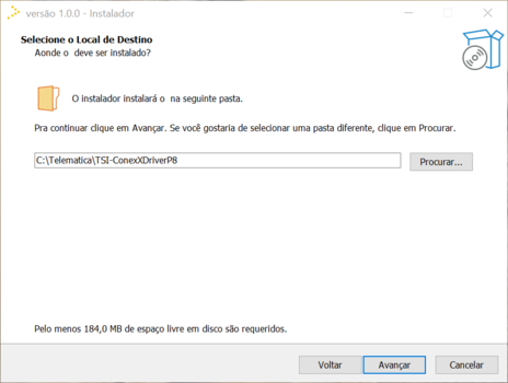Defina o Local de Instalação do ConeX, por padrão ele é instalado em: C:\Telematica\TSI-ConexXDriverP8