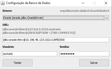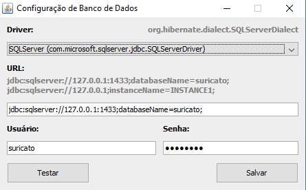 Preencha os campos como desejar configurar o Middleware e clique em "Testar", o mesmo realizará um teste de conexão na base inserida e vai te retornar falha ou sucesso, ao clicar em salvar o suricato.config vai salvar as configurações inseridas nos campos no seu arquivo .properties.