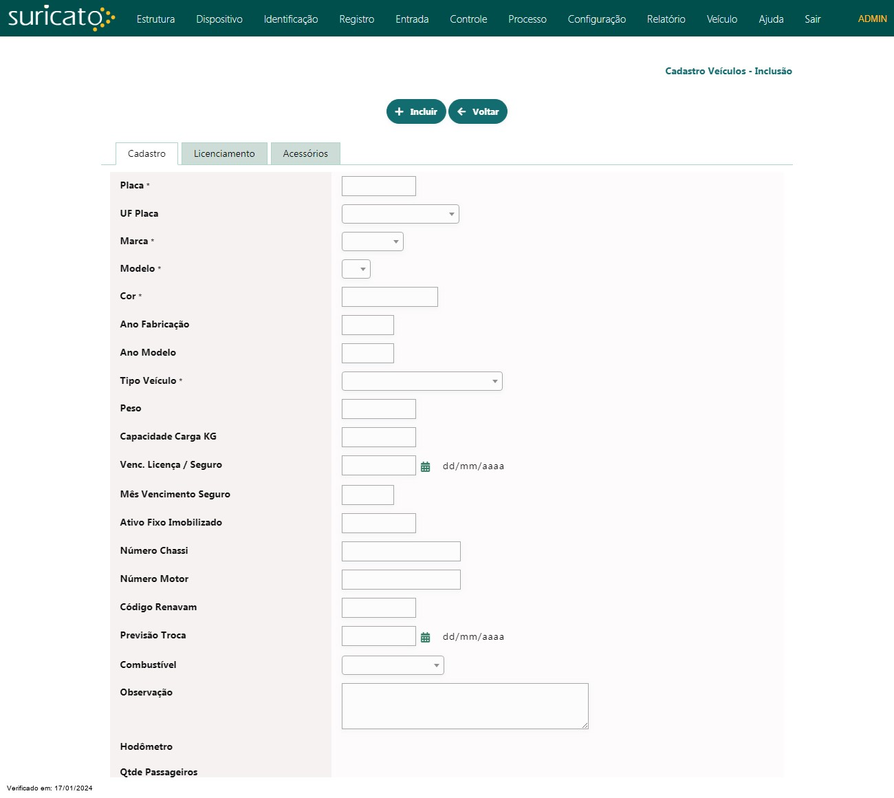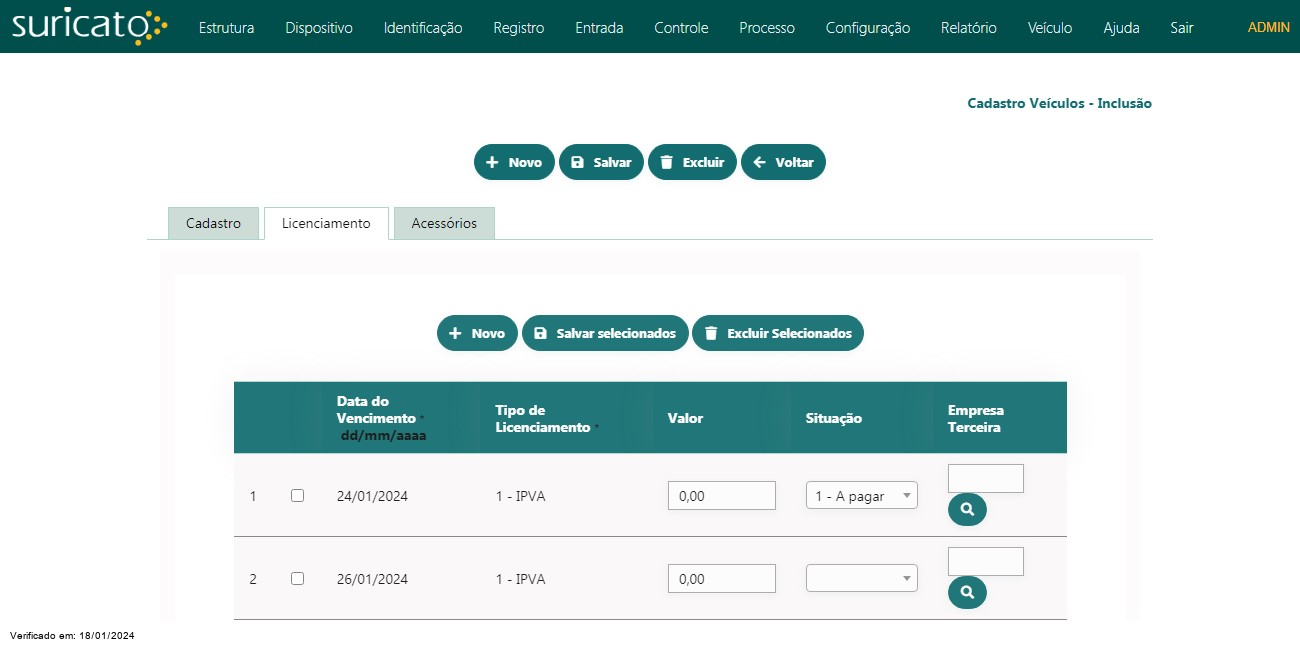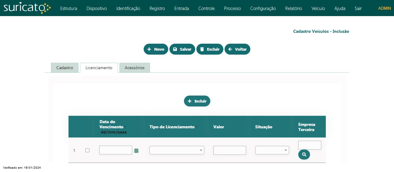 Nessa tela, inserimos os dados de licenciamento do veículo, dados como situação, valor do licenciamento e a empresa terceira vinculada a esse licenciamento.