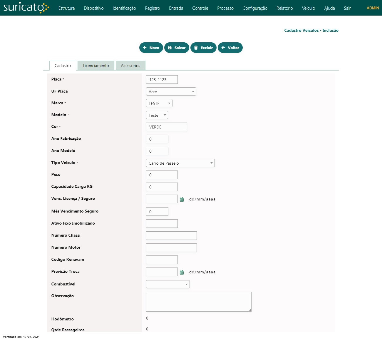 Placa: Campo informando a placa do veículo a ser cadastrado.