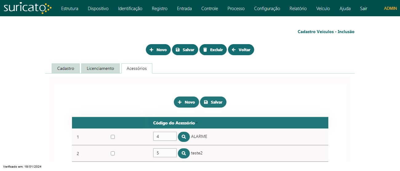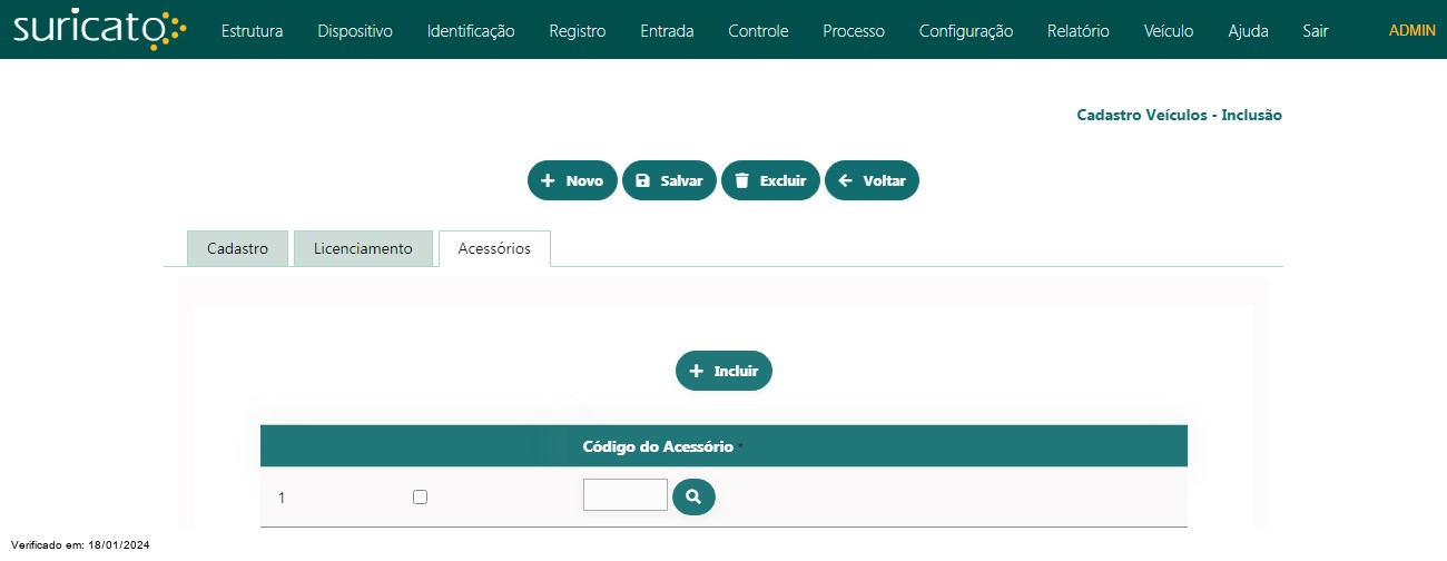 Na tela Acessórios, vinculamos os acessórios cadastrados ao cadastro de veículo.