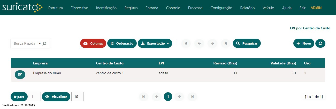 Nessa Tela podemos ter acesso aos EPIs por centro de custo cadastrados, sendo possível selecionar as colunas que estará disponivel para ser visualizada na tabela, podendo ordena-las pelas colunas de forma crescente(Asc) ou decrescente(Desc) para facilitar a visualização e a exportação da Tabela