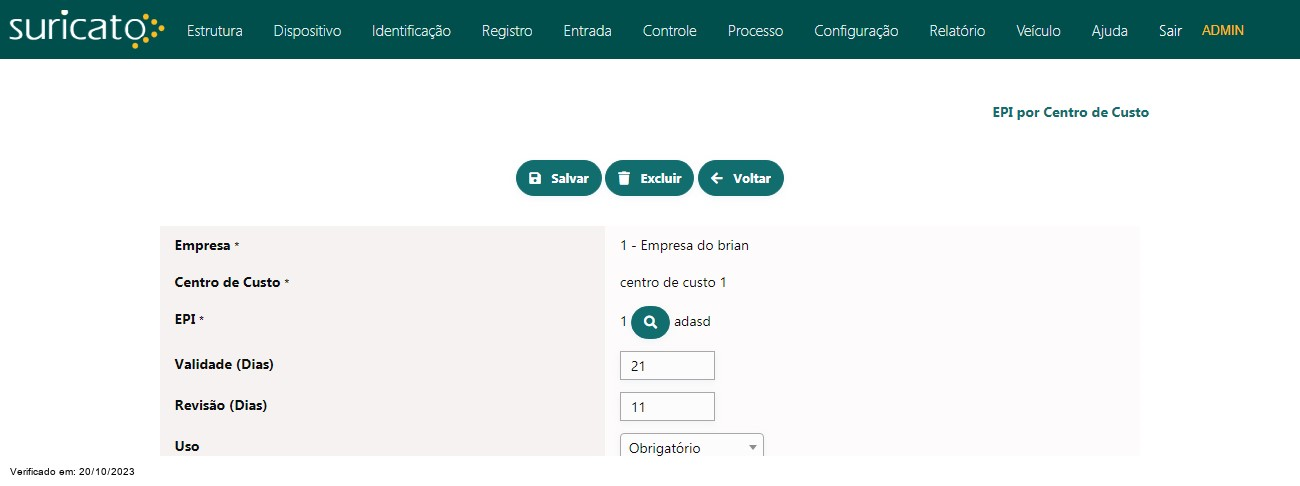 Nessa tela podemos cadastrar a relação de EPI por Centro de Custo, incluindo a data de revisão e validade do EPI e a obrigatoriedade do uso.