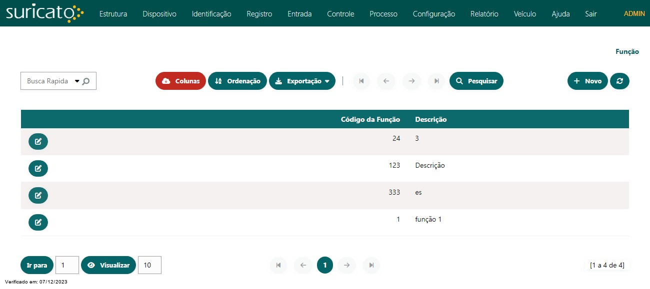 Nessa Tela podemos ter acesso as Funções cadastrados, sendo possível selecionar as colunas que estará disponivel para ser visualizada na tabela, podendo ordena-las pelas colunas de forma crescente(Asc) ou decrescente(Desc) para facilitar a visualização e a exportação da Tabela