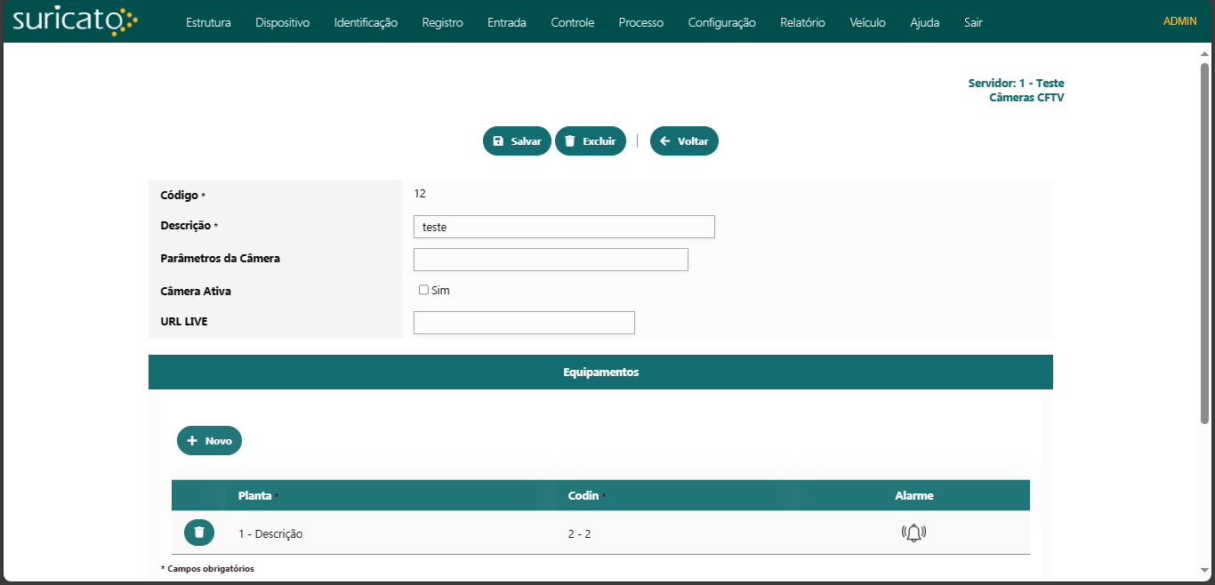 Nessa Tela podemos Visualizar todas os Codins Vinculados a Câmera, caso necessário podemos excluir um registro ou Adicionar um novo Registro