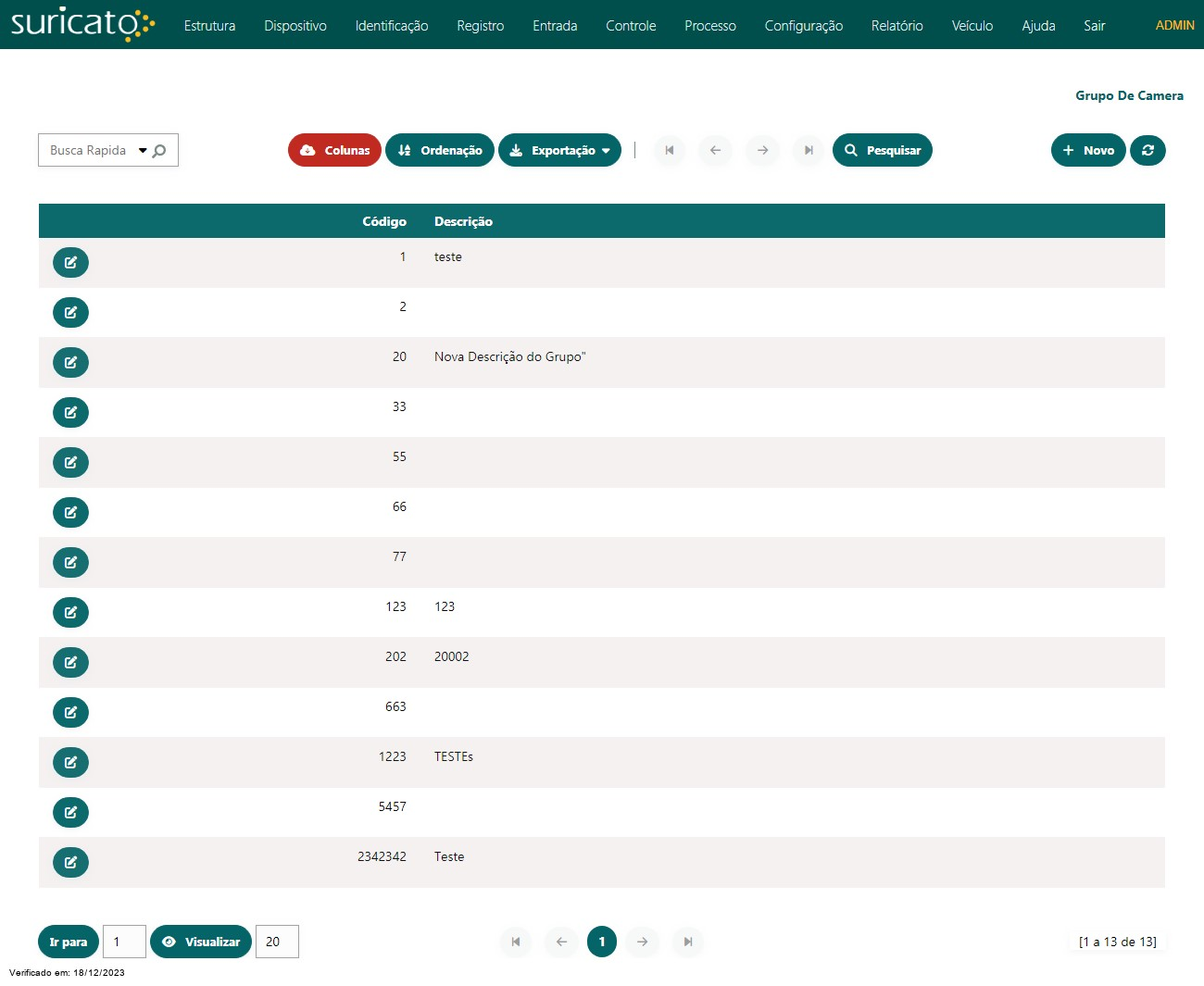 Nessa Tela podemos ter acesso aos Grupos de Câmeras cadastrados, sendo possível selecionar as colunas que estará disponivel para ser visualizada na tabela, podendo ordena-las pelas colunas de forma crescente(Asc) ou decrescente(Desc) para facilitar a visualização e a exportação da Tabela