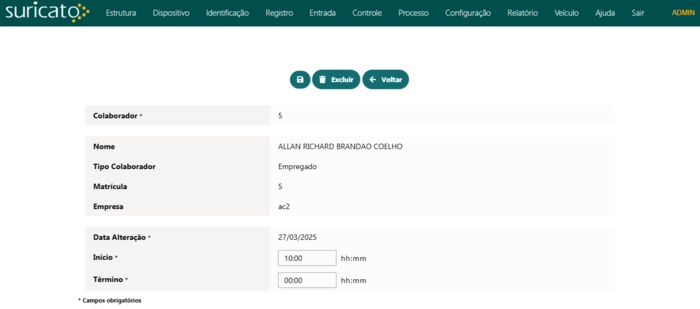 Na tela de Alteração podemos alterar o inicio e termino do seu horário!