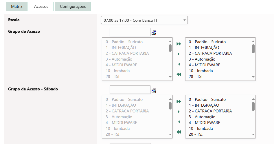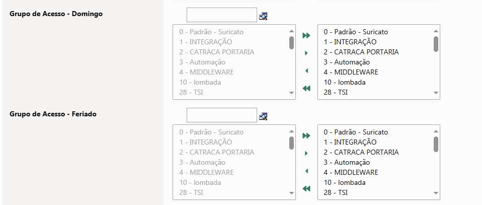 Na esquerda dos grupos de acessos temos as disponíveis e a direita as selecionadas, utilizando a borra superior podemos efetuar uma busca dos grupos de acessos disponíveis