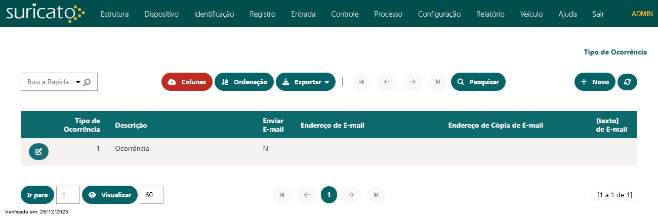 Nessa Tela podemos ter acesso aos Tipos de Ocorrência cadastrados, sendo possível selecionar as colunas que estará disponivel para ser visualizada na tabela, podendo ordena-las pelas colunas de forma crescente(Asc) ou decrescente(Desc) para facilitar a visualização e a exportação da Tabela