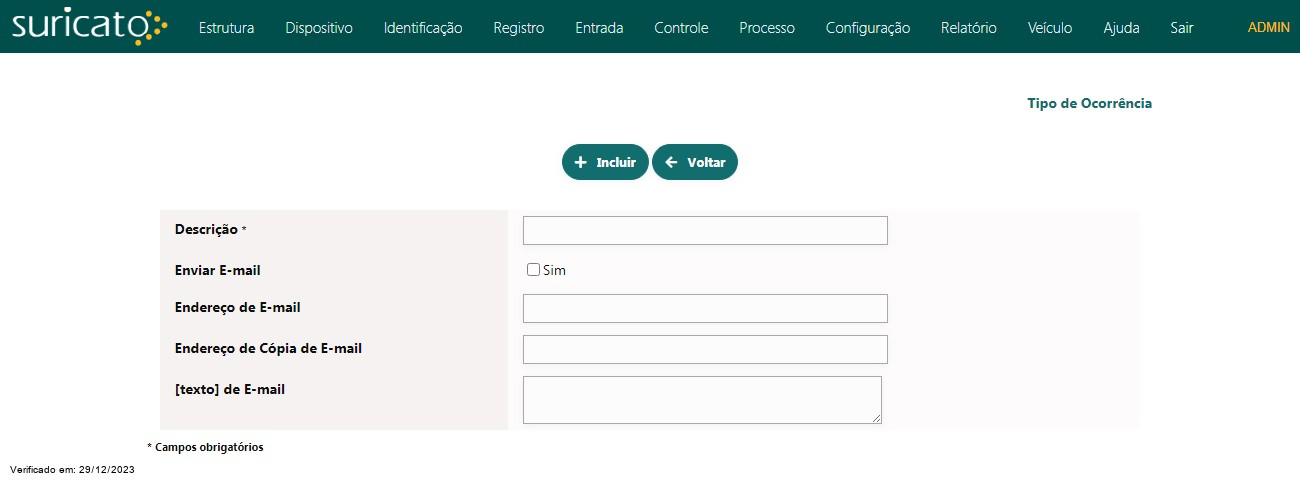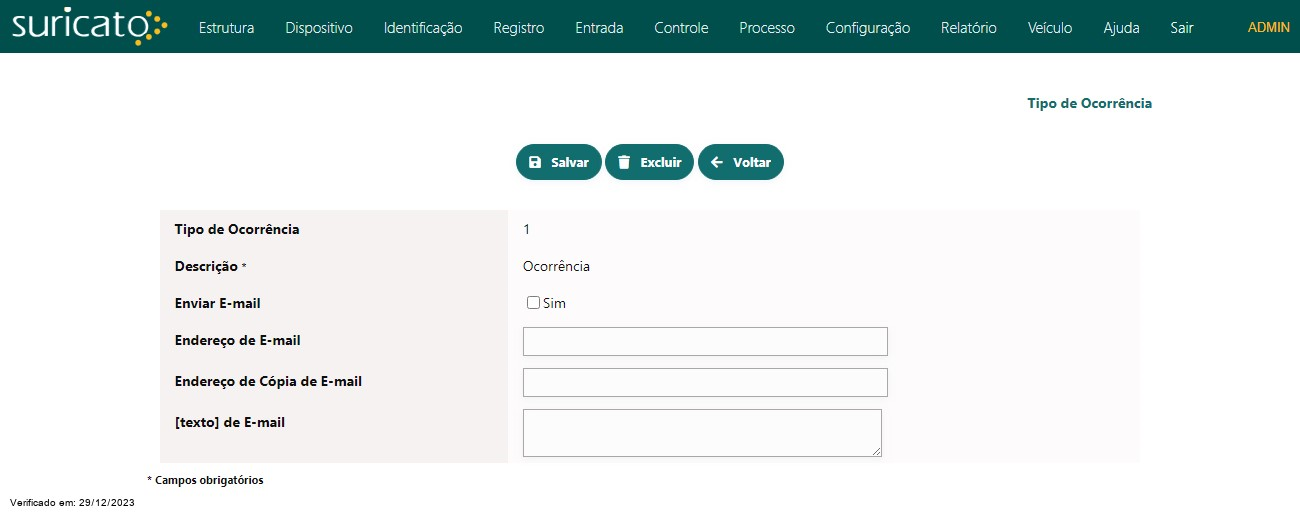 Enviar E-mail: Campo informando se a ocorrência deve ser enviada por e-mail.