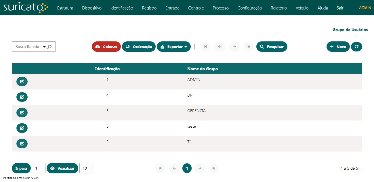 Na tela de Consulta de podemos visualizar os Grupo de Usuários cadastrados no sistema, seu Nome e a sua indentificação, sendo possível selecionar as colunas que estará disponivel para ser visualizada na tabela, podendo ordena-las pelas colunas de forma crescente(Asc) ou decrescente(Desc) para facilitar a visualização e a exportação da Tabela