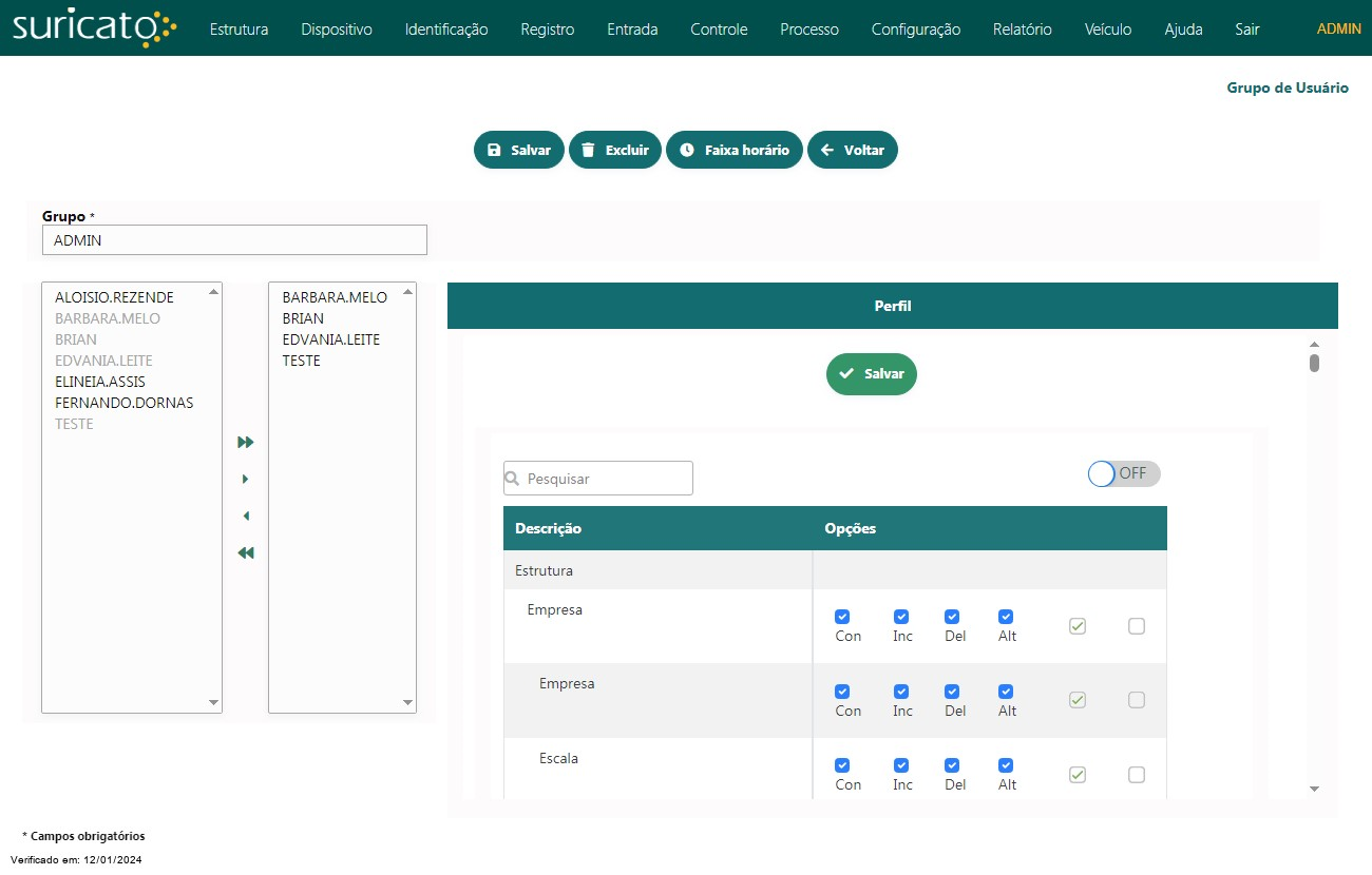 Restrição de acesso ao sistema: um mesmo usuário não pode efetuar login em duas máquinas simultaneamente. Confira abaixo a figura com o exemplo do grupo de acesso “ADMIN”, no qual devem ser direcionados quais usuários fazem parte deste grupo.