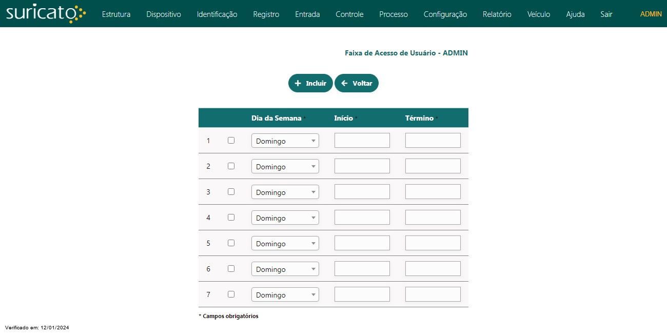 Nela podemos definir as faixas de horário em que os usuários dentro do grupo de acesso podem acessar o sistema SURICATO.